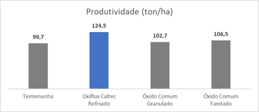 No experimento do IAC, foram avaliadas três formulações de óxidos: refinado, granulado e farelado. Apenas o óxido refinado apresentou ganhos significativos de produtividade, comprovando a importância da tecnologia de refino e fluidez no desempenho do insumo.