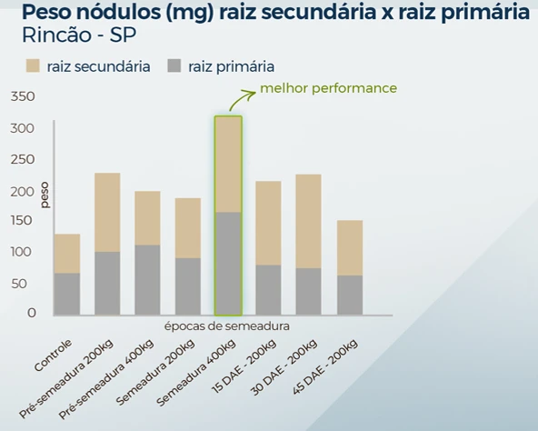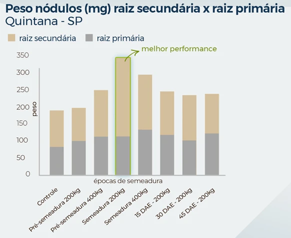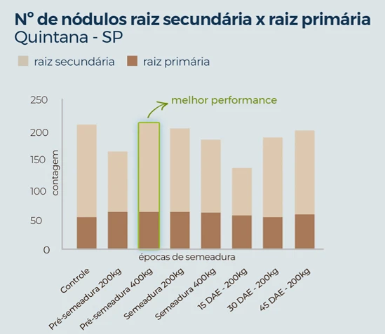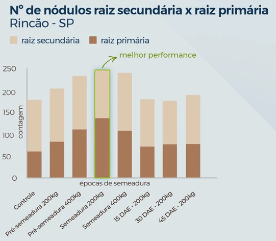 Nesse contexto, o OxiFlux chega para favorecer esse cenário, como mostram os experimentos conduzidos por C.F.S. (2025), em Quintana-SP e Rincão-SP, demonstrando que a aplicação de óxidos de Ca e Mg favoreceu o crescimento do sistema radicular e aumentou a nodulação em raízes primárias e secundárias, com destaque para aplicações em pré-semeadura e em semeadura.