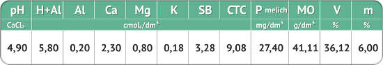 O solo onde foi usado OxiFlux é um solo bom, com CTC alta, com bastante matéria orgânica, porém apresenta baixa saturação de bases. Em decorrência da baixa saturação das bases, V% e pH são baixos. Também devido a baixa saturação das bases existe a presença de alumínio tóxico.