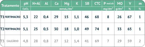 Percebe-se claramente que os dois tratamentos com Fertimacro melhoraram a fertilidade do solo: